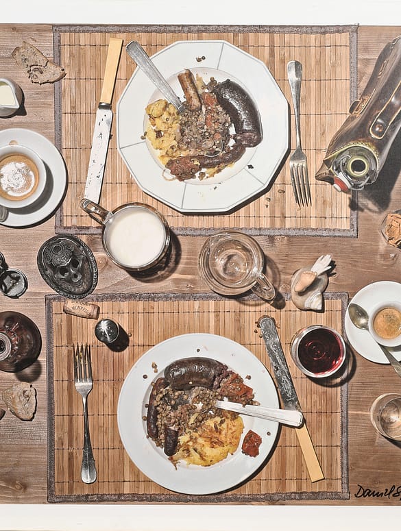Mit seinen dreidimensionalen Stillleben erfüllt der Objektkünstler und Mitbegründer des „Nouveaux Réalisme“ die neodadaistische Forderung, das reale Leben verstärkt in die Kunst einzubeziehen. Für Spoerri, der in seinem Restaurant zeitweise selbst hinter dem Herd stand und sich als „cuoco secreto“, als „Geheimkoch“ bezeichnet, ist das Kochen Teil der Bildenden Kunst. In seinen Werken und ideenreichen Aktionen beschäftigt er sich mit der Bedeutung von Nahrung für die menschliche Existenz und den sinnlichen Aspekten des Kochens und Essens. Wie stark sind wir von unseren Essgewohnheiten geprägt? Was hat es mit dem Geschmackssinn auf sich? Und was eignet sich eigentlich alles zum Verzehr? Spoerris Experimentierfreude und Kreativität zur Beantwortung dieser Fragen kennt dabei keine Grenzen. So kredenzte er schon Elefantenrüssel und erfand das „Palindromische Diner“, bei dem die normale Menüabfolge scheinbar umgekehrt wurde und die Gäste zuerst einen Espresso serviert bekamen. Was jedoch wie Kaffee aussah, stellte sich beim Geschmackstest als Suppe heraus.
