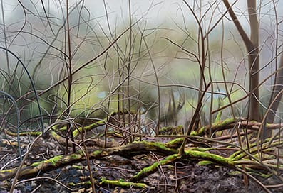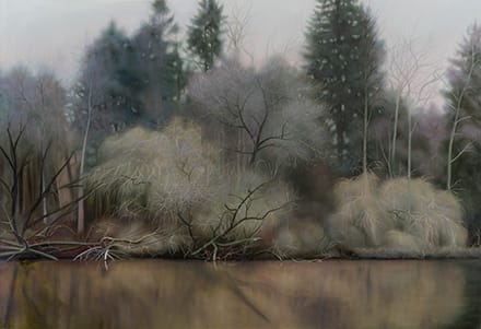 Die Malerei ist das Medium, mit dem sie in diesem medialen Handlungsprozess versucht, sich selbst in einer sich verändernden Welt zu verstehen. Haiying Xu arrangiert die einzelnen Szenen aus ihrem Zeichenblock auf der großen Leinwand in einer Weise, die an Comics erinnert. Als Kind habe sie gerne Comics gelesen, erzählt sie im Gespräch, und die erzählerische Kraft, die in diesem comicartigen Format steckt, habe sie fasziniert. So vermischt die Künstlerin ihre Erinnerungen und Faszinationen aus der Vergangenheit, ihre Sinneseindrücke und ihre gegenwärtige Verarbeitung dieser Sinneseindrücke. So konstruiert sie in ihrer Malerei eine interessante Zeit-Raum-Konstellation, die sich dem Betrachter in mehrdimensionalen Perspektiven gleichzeitig erschließt. Vergänglichkeit ist in ihren Bildern präsent. Die Frage, in welchem Zeit-Raum hier eine Geschichte inszeniert wird, scheint unnötig und überflüssig. Der Verzicht auf die Inszenierungsstruktur traditioneller Erzählkunst bietet den Boden, von dem aus ihre Malerei rätselhaft geheimnisvoll ausstrahlt. In der undramatischen Dramaturgie verbirgt sich die tief in der Psyche der Künstlerin verankerte Ratlosigkeit, die sie in ihren konfliktreichen Lebenswelten oft selbst erfährt. In der melancholischen Grundstimmung, die in ihrer Kunstwelt spürbar ist, finde ich eine Ähnlichkeit mit der malerischen Aura eines Casper David Friedrich. Haiying Xu legt ihren künstlerischen Fokus auf die Darstellbarkeit von Stimmungen, in denen sich die emotionale Ergriffenheit eines Subjekts mit der menschenleeren Atmosphäre der Naturlandschaft verbindet und vereint.