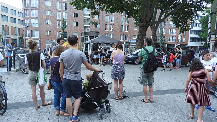 Die Auswahl unserer Spielorte hat mit dem Grundgedanken zu tun, Musik dort erlebbar zu machen, wo sonst eher selten oder nie Mittel der Kulturförderung ankommen. Viele der Orte werden als ‚soziale Brennpunkte‘ wahrgenommen, beispielsweise der Wiener Platz im Mülheim, oder der Kölnberg. Wir sind deswegen ganz gezielt an solche Orte gefahren und haben uns angesehen, wen wir dort zu welcher Zeit erreichen können. Die Gruppe Jugendlicher, die mit dem Handy HipHop hört; die Kids im Fußball-Trikot, mit denen wir uns sprachlich nicht verständigen konnten, die dafür umso begeisterter das Schlagzeug ausprobiert haben; die ältere Frau auf dem Wochenmarkt in Chorweiler, die uns von ihrer Rente etwas abgeben wollte, weil sie so begeistert war. An unseren Konzertorten haben wir Menschen getroffen, denen wir sonst eher sporadisch begegnen. Und wir haben ihnen das Gefühl vermittelt, dass sie nicht vergessen wurden, dass auch bei Ihnen mal etwas passiert, was sie sonst nur im Fernsehen sehen. Diese Rückmeldung haben wir nach jedem Konzert erhalten.