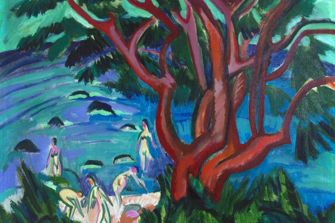 Es ist eine Szene vermeintlicher Idylle: Badende schwimmen im Wasser und unterhalten sich am Strand unter einem großen markanten Baum, dessen Stamm und Äste in einem glühenden Rot erstrahlen. Die expressive Farbgebung und grobe Pinselführung führt jedoch nicht zu einem friedlich wirkenden Eindruck, sondern wirkt pulsierend oder gar bedrohlich, als würde sich die Natur in innere Erregung verwandeln. Ernst Ludwig Kirchners 1913 entstandenes Gemälde entfaltet eine ungeheure Kraft, indem es Farbe und Form nicht zur Abbildung, sondern zum Ausdruck seelischer Spannungen einsetzt. So wird das Ursprüngliche, Wilde und Ungebändigte der Natur sichtbar – exemplarisch für jene emotionale und radikal expressive Bildsprache, die den Expressionismus prägte und seit dem 26. September Besucherinnen und Besucher der Kunsthalle Mannheim in die aufwühlende Welt dieser künstlerischen Bewegung der Moderne zieht.