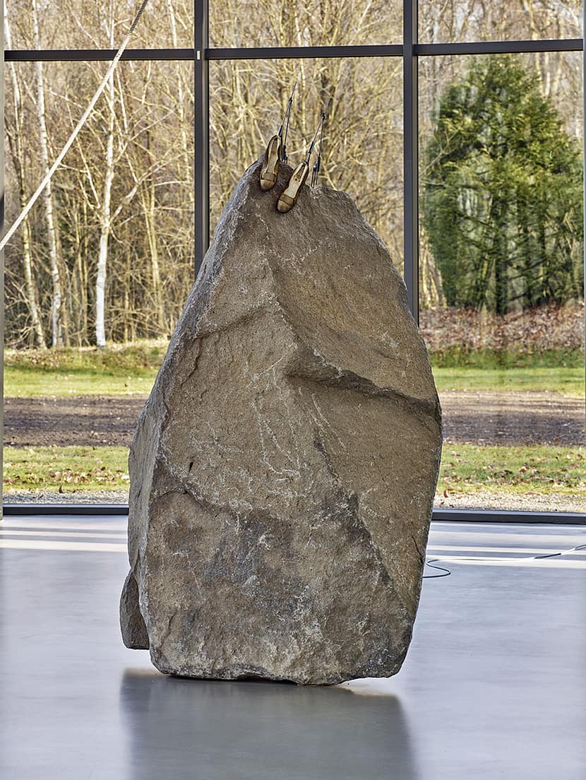 Auch die übrigen Räume zeigen, wie weit Horn den Begriff der Skulptur geöffnet hat. Im oberen Pavillon steht mit „Turm der Namenlosen“ von 1994 eine Arbeit, die auf den Jugoslawienkrieg reagiert und aus historischen Obstleitern, Geigen und Mechanik einen fragilen Erinnerungsraum bildet. Daneben tritt unter anderem die „Preußische Brautmaschine“ von 1988 auf, die Horns Nähe zum Surrealismus und zum Readymade erkennen lässt. Schließlich ist dort mit „El Calvario“ (1997) eine Arbeit zu sehen, die sich tief einprägt. Stein, ein Paar Frauenschuhe, Motor und Messing sind hier zu einer Szenerie verbunden, deren Bewegung nach längeren Pausen intervallartig einsetzt: Das alte Schuhpaar scheint immer wieder zu einem Schritt anzusetzen, doch jeder Aufbruch bleibt aussichtslos: Statt einen Weg zu gewinnen, müsste es am Stein abrutschen. Gerade darin liegt die beklemmende Wirkung dieser Arbeit. Im Umfeld von „Turm der Namenlosen“ ruft sie Assoziationen von Flucht, Verfolgung und erzwungener Bewegung auf — und öffnet damit einen historischen Resonanzraum, in dem sich unweigerlich auch Erinnerungen der deutschen Geschichte einstellen. Bewegung erscheint hier nicht als Fortkommen, sondern als tragische Geste der Vergeblichkeit.