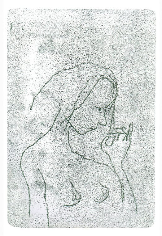 Ölfarbenzeichnung (Monotypie) auf Papier, 30 x 42 cm. 18 (unterschiedliche Motive), signiert, datiert. Zusammen mit Künstlerbuch und Ex Libris (Offset) in einer Klappkassette (Leinen). Auflage 18 Unikate.